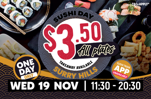 Read MoreSushi Train Surry Hills Date: 19/11/2025 (Wed)All Plates $3.50 Udon, Ramen, Rice Bowls, Soba, Sashimi and Drinks are…